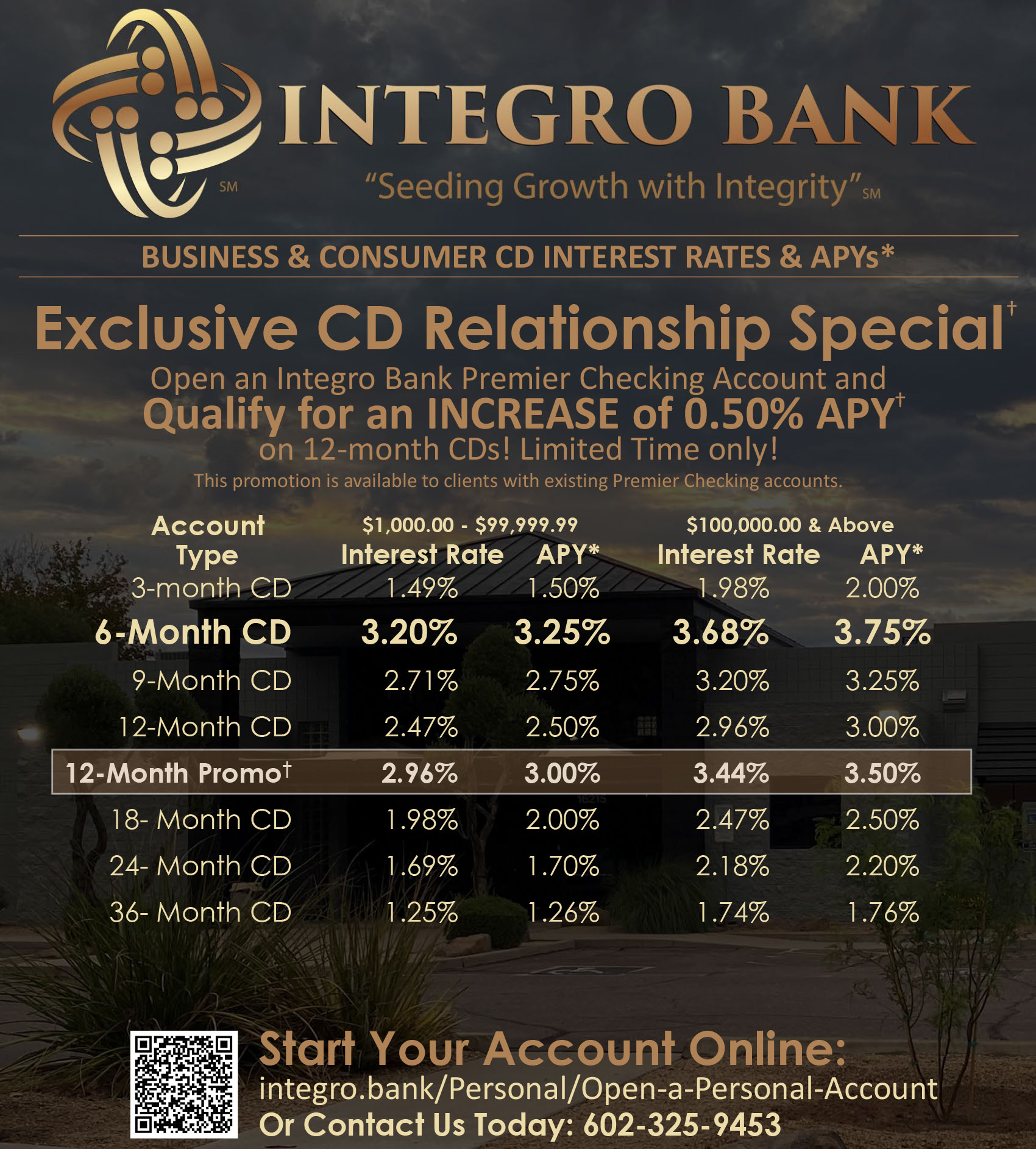 † CD Promotion (CD Promo) is available to personal and business customers and is subject to change without notice. CD promotion rate is available for the initial term Management reserves the right to discontinue the promotion at any time. In order to qualify for the CD Promo rate, a consumer must open or have an existing Premier Checking account, or a business must have or open a Business Premier Checking account. A minimum of $100 is required to open a Premier checking or Business Premier checking account. Please refer to consumer Fee Schedule and business Fee Schedule for minimum balance requirements and other fees.